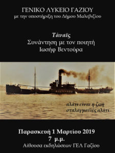Το Γενικό Λύκειο Γαζίου, σε συνεργασία με το Δήμο Μαλεβιζίου, διοργανώνουν μια βραδιά – αφιέρωμα στον ποιητή Ιωσήφ Βεντούρα και το έργο του Τάναϊς, την Παρασκευή 1 Μαρτίου 2019 και ώρα 7 μ.μ., στην αίθουσα εκδηλώσεων του Γ.Ε.Λ. Γαζίου.