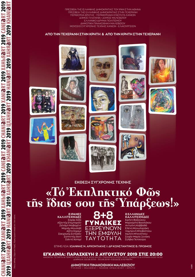 Στην έκθεση σύγχρονης τέχνης: «Το Εκπληκτικό Φως της Ίδιας σου της Υπάρξεως! / 8+8 Γυναίκες Εξερευνούν την Έμφυλη Ταυτότητα» συμμετέχουν 8 Ιρανές γυναίκες ζωγράφοι και 8 Ελληνίδες ζωγράφοι σε επιμέλεια των Δρ Κωνσταντίνου Β. Πρώιμου και Ιωάννη Ν. Αρχοντάκη, που οργανώνεται από το Μουσείο Σύγχρονης Τέχνης Χανίων – Ελαιουργείον στο πλαίσιο της σειράς δράσεων πολιτισμού «Από την Τεχεράνη στην Κρήτη και από την Κρήτη στην Τεχεράνη» εορτάζοντας τα 10 χρόνια πολιτιστικής παρουσίας του Μουσείου και εντάσσεται στο εικαστικό πρόγραμμα «ΧΑΝΙaRT 2019».