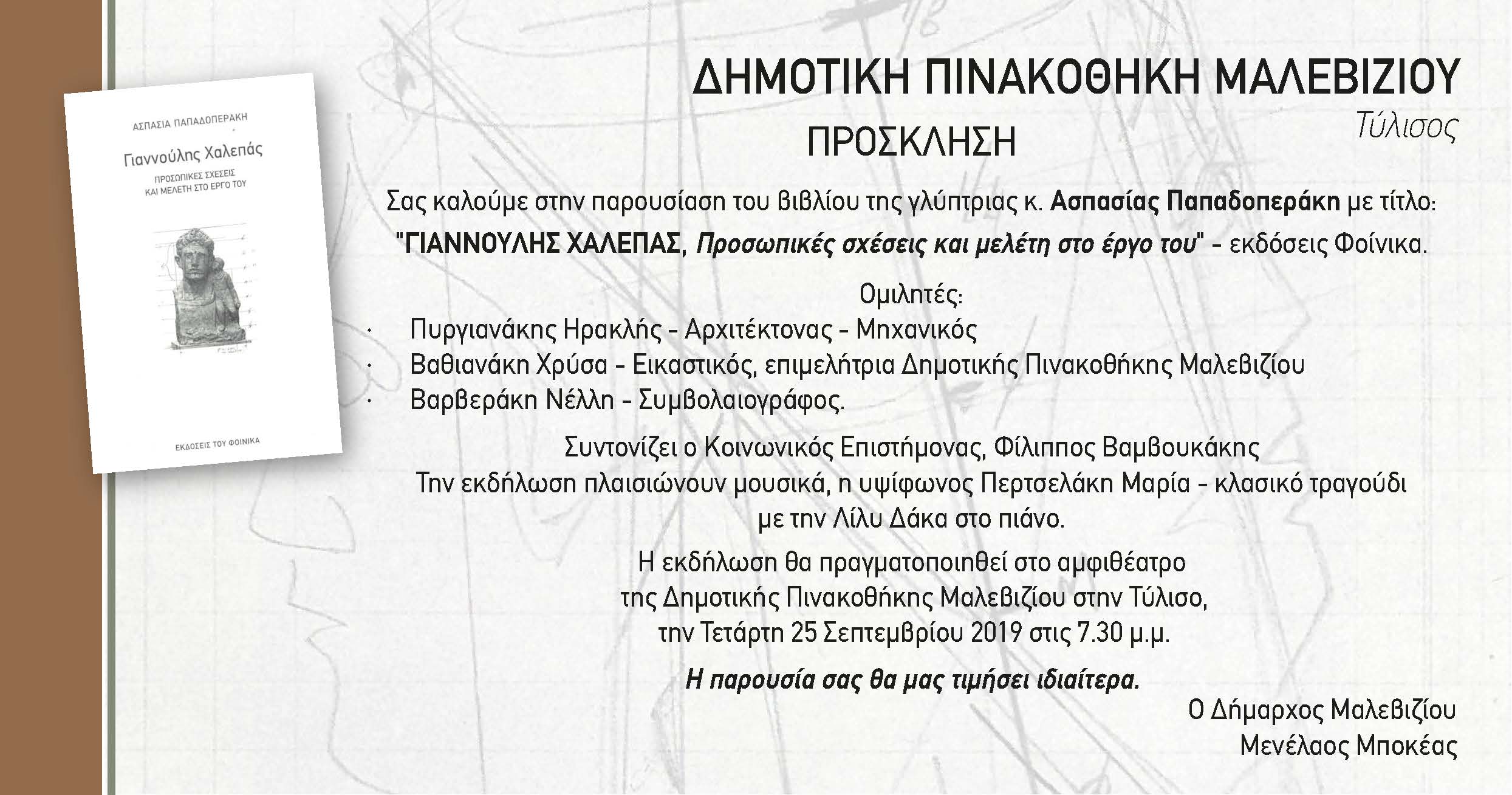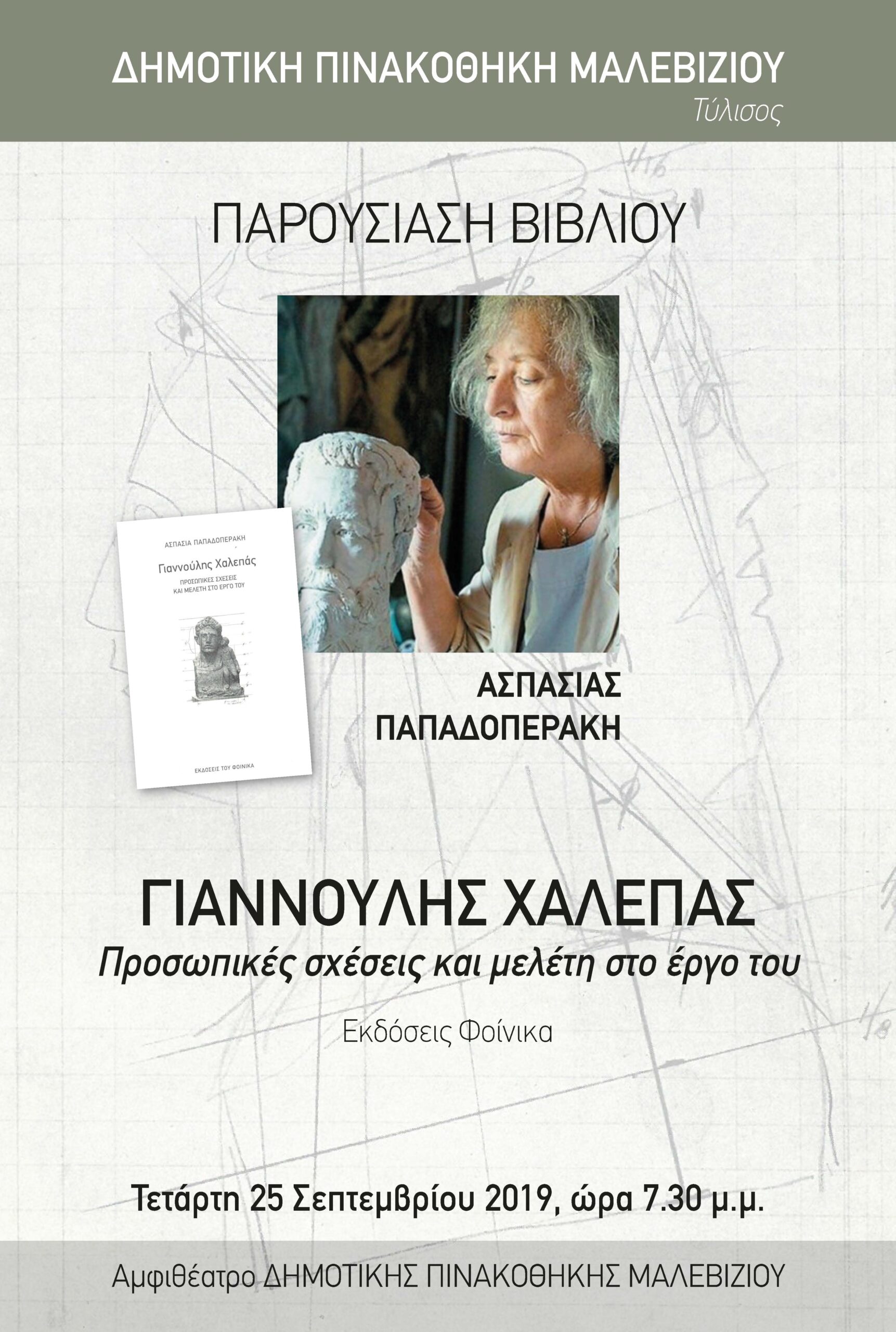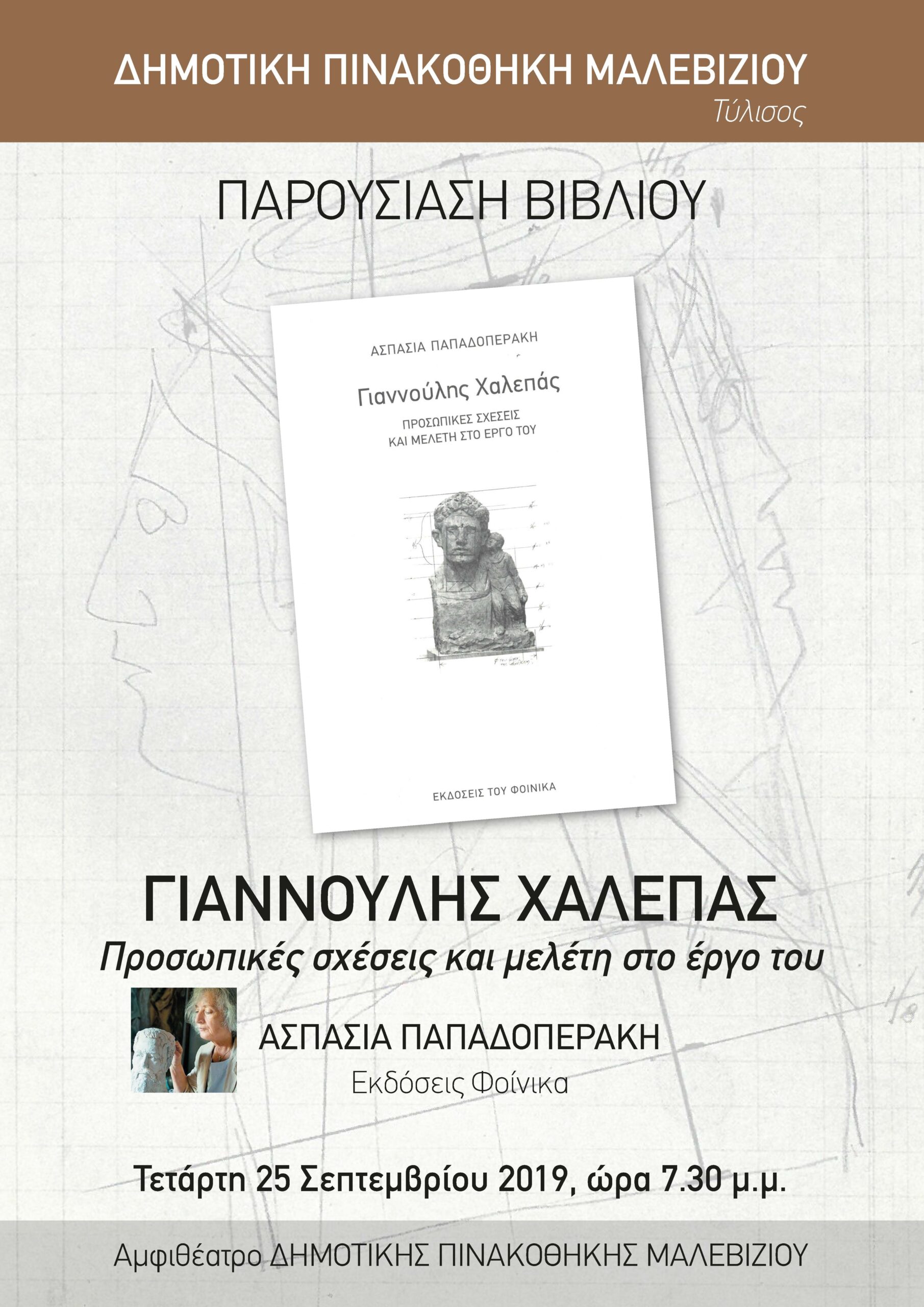 Το βιβλίο της γλύπτριας Ασπασίας Παπαδοπεράκη με τίτλο “ΓΙΑΝΝΟΥΛΗΣ ΧΑΛΕΠΑΣ, Προσωπικές σχέσεις και μελέτη στο έργο του” από τις εκδόσεις Φοίνικα, παρουσιάζεται αυτήν την Τετάρτη 25 Σεπτεμβρίου από τη Δημοτική Πινακοθήκη Μαλεβιζίου.