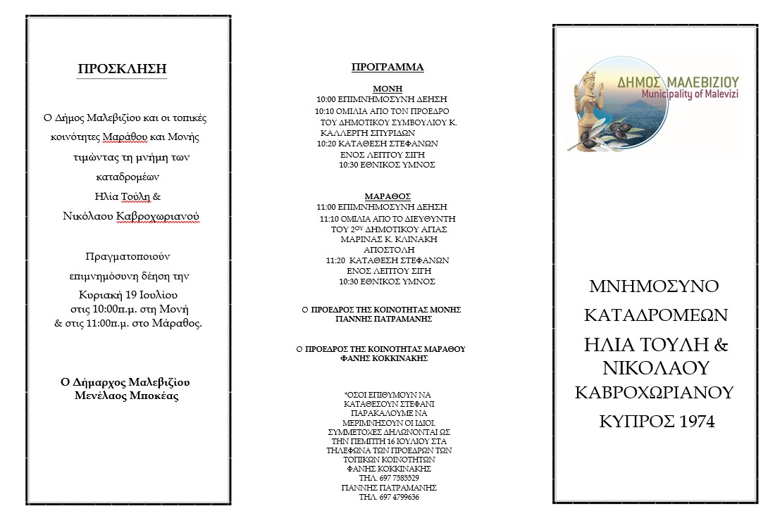 Τη μνήμη των καταδρομέων Ηλία Τούλη & Νικόλαου Καβροχωριανού τιμά ο Δήμος Μαλεβιζίου αυτήν την Κυριακή 19 Ιουλίου σε συνεργασία με τις τοπικές κοινότητες του Μαράθου και της Μονής, διοργανώνοντας δύο τελετές στους αντίστοιχους οικισμούς.