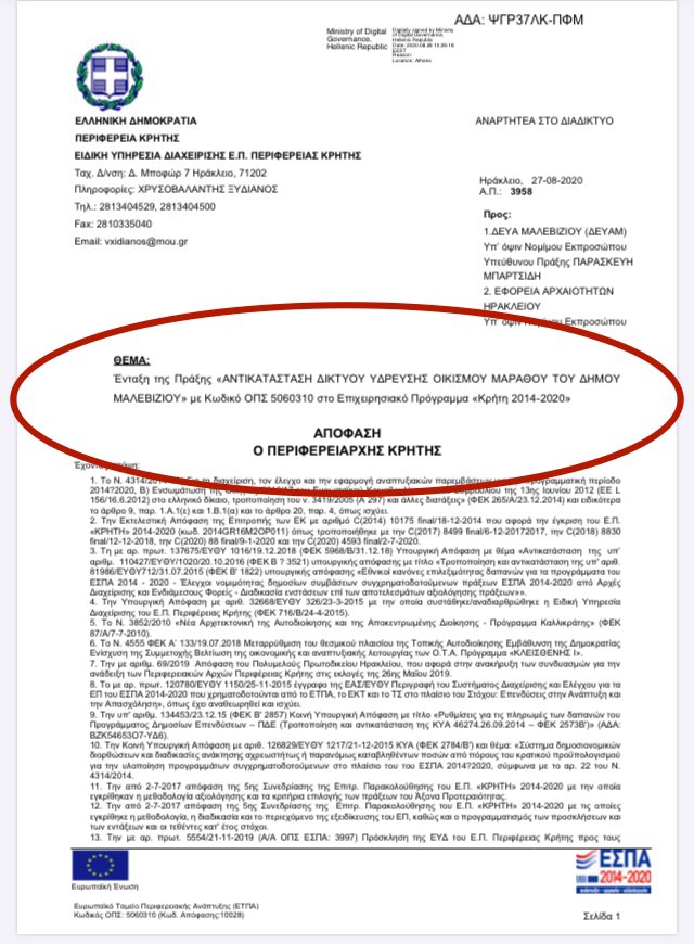 Στο ΠΕΠ Κρήτης εντάχθηκε το έργο που προγραμμάτισε ο Δήμος Μαλεβιζίου για το υδρευτικό δίκτυο στον οικισμό Μαράθου. Συγκεκριμένα, το έργο συνολικού προϋπολογισμού 449.000,00€, αφορά στην αντικατάσταση του υφιστάμενου υδρευτικού δικτύου και φορέας υλοποίησης είναι η ΔΕΥΑ Μαλεβιζίου. Τη σχετική απόφαση ένταξης στο ΕΣΠΑ υπέγραψε ο Περιφερειάρχης Κρήτης κ. Σταύρος Αρναουτάκης.