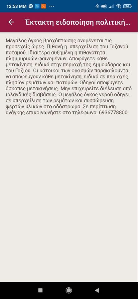 Μεγάλος όγκος βροχόπτωσης αναμένεται τις προσεχείς ώρες. Πιθανή η  υπερχείλιση του Γαζανού ποταμού. Ιδιαίτερα αυξημένη η πιθανότητα πλημμυρικών φαινομένων. Αποφύγετε κάθε μετακίνηση, ειδικά στην περιοχή της Αμμουδάρας και του Γαζίου. Οι κάτοικοι των οικισμών παρακαλούνται να αποφεύγουν κάθε μετακίνηση, ειδικά σε περιοχές πλησίον ρεμάτων και ποταμών. Οδηγοί αποφύγετε άσκοπες μετακινήσεις. Μην επιχειρείτε διέλευση από ιρλανδικές διαβάσεις. Ο μεγάλος όγκος νερού οδηγεί σε υπερχείλιση των ρεμάτων και συσσώρευση φερτών υλικών στο οδόστρωμα. Σε περίπτωση ανάγκης επικοινωνήστε στο τηλέφωνο: 6936778800»