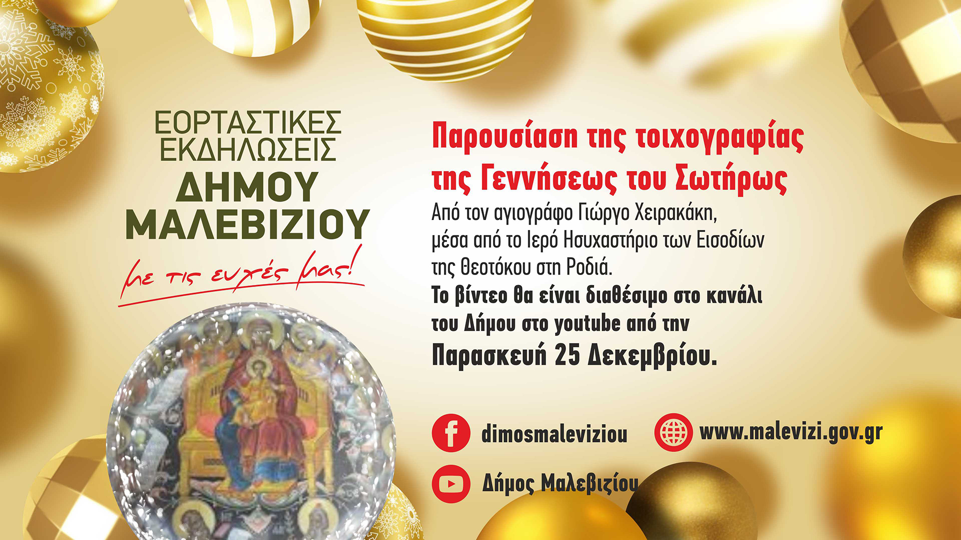 Μια ακόμη διαδικτυακή δράση του Δήμου Μαλεβιζίου μπορείτε να παρακολουθήσετε στο κανάλι του Δήμου στο YouTube. Πρόκειται για διαδικτυακή ξενάγηση στην τοιχογραφία της «Γεννήσεως του Σωτήρος» στο Ιερό Ησυχαστήριο των Εισοδίων Της Θεοτόκου της Ροδιάς.