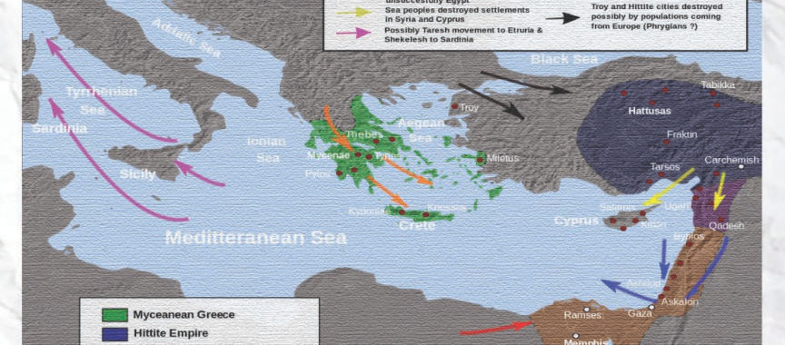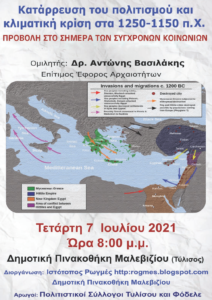 Τότε, μέσα σε ένα αιώνα, μαζί με τους πολιτισμούς της Εγγύς Ανατολής κατέρρευσε και ο δικός μας μινωικός-μυκηναϊκός πολιτισμός, όπως θα δούμε και θα ακούσομε στην ομιλία. Γιατί όποιοι δεν θυμούνται το παρελθόν είναι καταδικασμένοι να το επαναλάβουν και μάλιστα με χειρότερες συνθήκες.