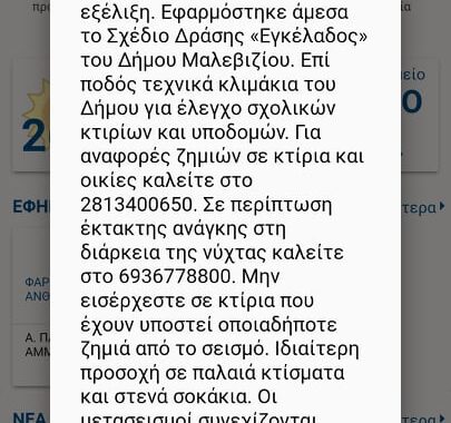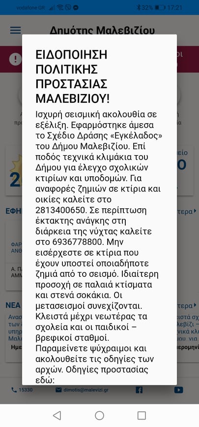 Ειδοποίηση στα κινητά τηλέφωνα των δημοτών του Μαλεβιζίου που είναι χρήστες της δωρεάν εφαρμογής (application) «Δημότης Μαλεβιζίου» απέστειλε η Πολιτική Προστασία του Δήμου. Από την πρώτη στιγμή της σεισμικής δραστηριότητας ενεργοποιήθηκε το εγκεκριμένο Σχέδιο Δράσης Πολιτικής Προστασίας «Εγκέλαδος» του Δήμου Μαλεβιζίου.