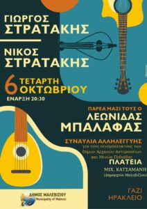 Έναν ακόμη κρίκο στην τεράστια αλυσίδα αλληλεγγύης που έχει στηθεί για τους σεισμόπληκτους των Δήμων Αρχανών Αστερουσίων και Μινώα Πεδιάδας θέλει να προσθέσει ο Δήμος Μαλεβιζίου σε συνεργασία με τους γνωστούς καλλιτέχνες Γιώργο και Νίκο Στρατάκη.