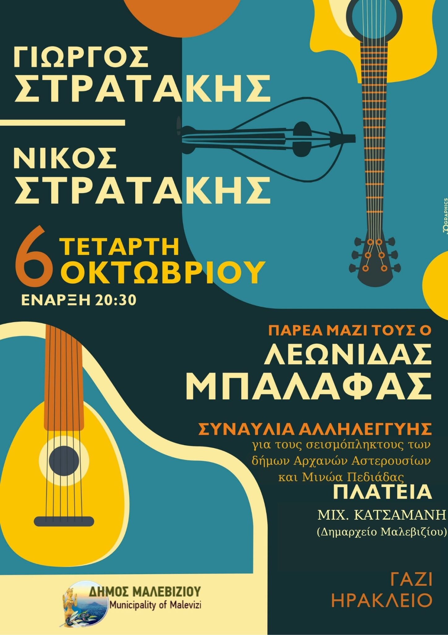 Την Τετάρτη 6 Οκτωβρίου στις 20.30 στην κεντρική πλατεία του Γαζίου οι δύο καταξιωμένοι καλλιτέχνες μαζί με τον Λεωνίδα Μπαλάφα σε μία συναυλία ανθρωπιάς και αλληλεγγύης καλούν όλους τους πολίτες να στηρίξουν τους συμπατριώτες μας που δοκιμάζονται από τους σεισμούς.