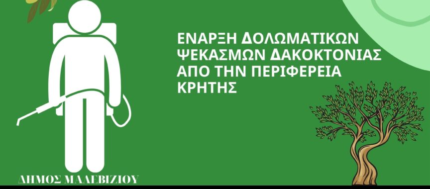 Σε Κεραμούτσι, Καμάρι, Μονή και Τύλισο ξεκινούν την Πέμπτη 16 Ιουνίου οι δολωματικοί ψεκασμοί στο Δήμο Μαλεβιζίου, για την καταπολέμηση του δάκου από τη Διεύθυνση Αγροτικής Ανάπτυξης της Περιφερειακής Ενότητας Ηρακλείου.