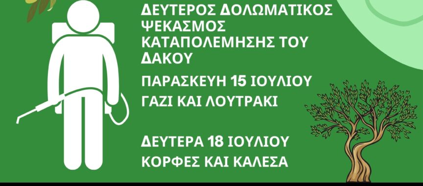 Παρακαλούνται όσοι ελαιοπαραγωγοί έχουν περιφραγμένα ελαιόφυτα να μεριμνήσουν ώστε ο εργολάβος ψεκασμού να έχει πρόσβαση στα δένδρα τους για να μπορεί να τα ψεκάσει και οι βιοκαλλιεργητές να σημαδέψουν τα ελαιόφυτά τους για να αποφευχθεί ανεπιθύμητος ψεκασμός.