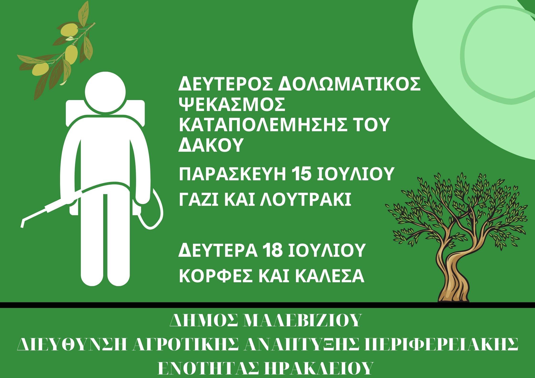 Αύριο Παρασκευή 15 Ιουλίου ξεκινά ο δεύτερος δολωματικός ψεκασμός για την καταπολέμηση του δάκου σε περιοχές του Δήμου Μαλεβιζίου, στο πλαίσιο του προγράμματος δακοκτονίας της Περιφερειακής Ενότητας Ηρακλείου.