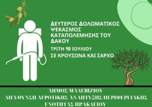 Στο Σάρχο και στον Κρουσώνα θα πραγματοποιηθεί την Τρίτη 19 Ιουλίου ο δεύτερος δολωματικός ψεκασμός για την καταπολέμηση του δάκου στο πλαίσιο του προγράμματος δακοκτονίας της Περιφερειακής Ενότητας Ηρακλείου.