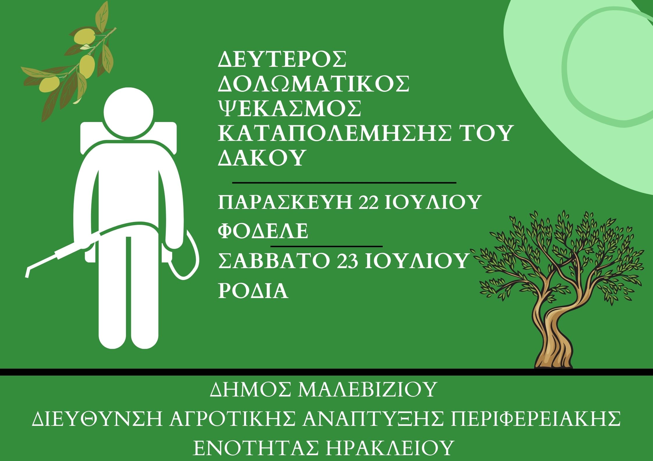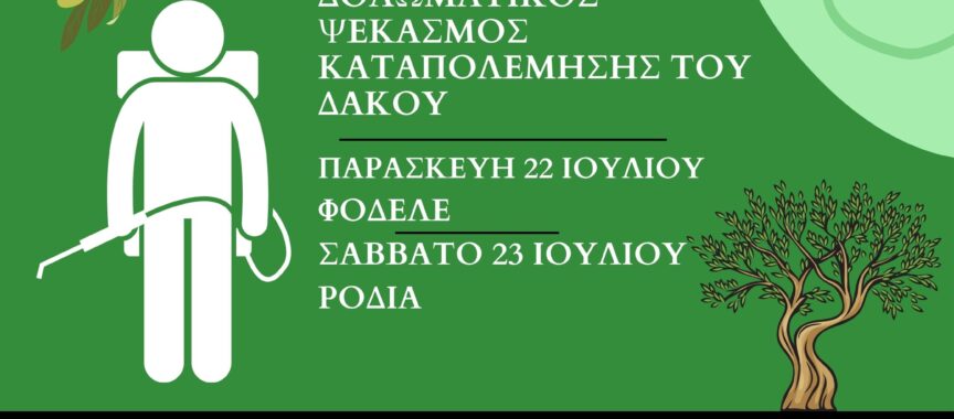 Στο Φόδελε οι ψεκασμοί θα γίνουν την Παρασκευή 22 Ιουλίου ενώ την επόμενη μέρα το Σάββατο 23 Ιουλίου οι ψεκασμοί θα πραγματοποιηθούν στη Ροδιά στο πλαίσιο του προγράμματος δακοκτονίας της Περιφερειακής Ενότητας Ηρακλείου.