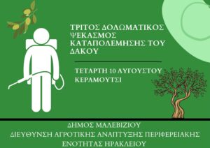 Στο Κεραμούτσι θα πραγματοποιηθεί την Τετάρτη 10 Αυγούστου ο τρίτος δολωματικός ψεκασμός για την καταπολέμηση του δάκου με βάση τον προγραμματισμό που έχει γίνει από τη Διεύθυνση Αγροτικής Ανάπτυξης της Περιφερειακής Διεύθυνσης Ηρακλείου.