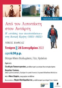 H Δημοτική Βιβλιοθήκη Μαλεβιζίου και οι εκδόσεις Αλεξάνδρεια παρουσιάζουν το βιβλίο του Νίκου Βαφέα Από τον λιποτάκτη στον αντάρτη. Η «στάσις των ανυποτάκτων στη Δυτική Κρήτη (1921-1922). Πρόκειται για την εξιστόρηση ενός σχετικά άγνωστου περιστατικού που συνδέεται με τα τεκταινόμενα στον πόλεμο της Μικρασίας και τον Εθνικό Διχασμό. Όπως αναφέρεται και στον τίτλο του βιβλίου η έμφαση δίνεται στην Δυτική Κρήτη, υπάρχουν όμως και πολλές αναφορές για την κατάσταση που επικρατούσε την περίοδο εκείνη στο Μαλεβίζι και την ευρύτερη περιοχή του Ηρακλείου.