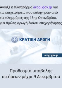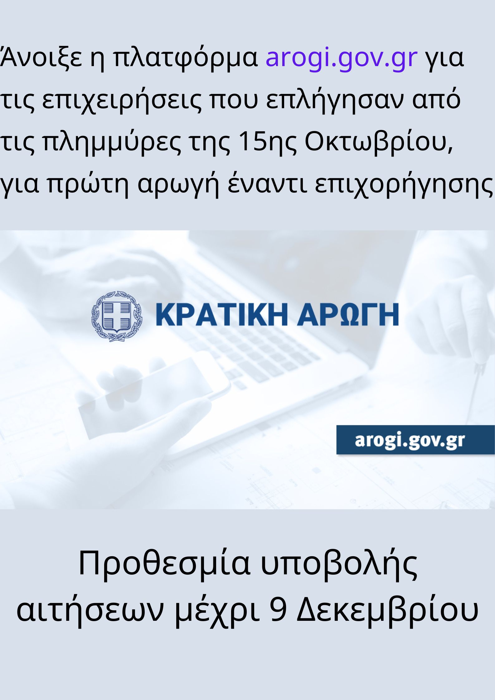 Άνοιξε εκ νέου η πλατφόρμα arogi.gov.gr για τις επιχειρήσεις που επλήγησαν από τα ακραία καιρικά φαινόμενα της 15ης Οκτωβρίου στην Κρήτη και επιθυμούν να λάβουν πρώτη αρωγή έναντι επιχορήγησης, σε συνέχεια της έκδοσης σχετικής τροποποιητικής κοινής απόφασης των Υπουργών Οικονομικών και Ανάπτυξης και Επενδύσεων, Αγροτικής Ανάπτυξης και Τροφίμων και Επικρατείας (ΦΕΚ Β΄ 6011/25.11.2022).