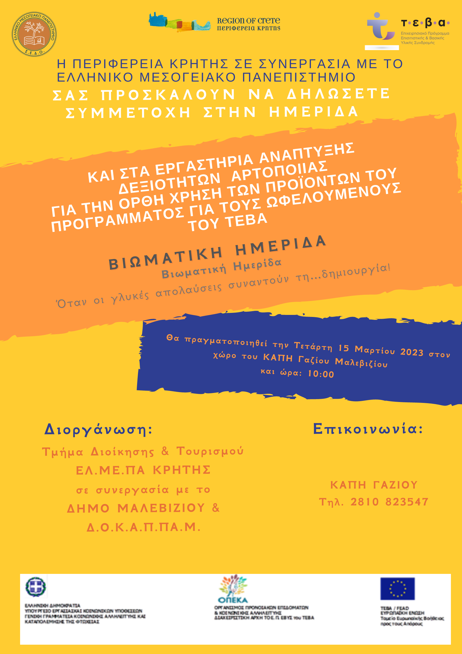 Την ανάπτυξη δεξιοτήτων στην αρτοποιία και την κρητική κουζίνα έχει στόχο η ημερίδα που απευθύνεται σε ωφελούμενους του προγράμματος ΤΕΒΑ του Δήμου Μαλεβιζίου και διοργανώνεται από την Περιφέρεια Κρήτης σε συνεργασία με το τμήμα Διοίκησης και Τουρισμού του Ελληνικού Μεσογειακού Πανεπιστημίου.