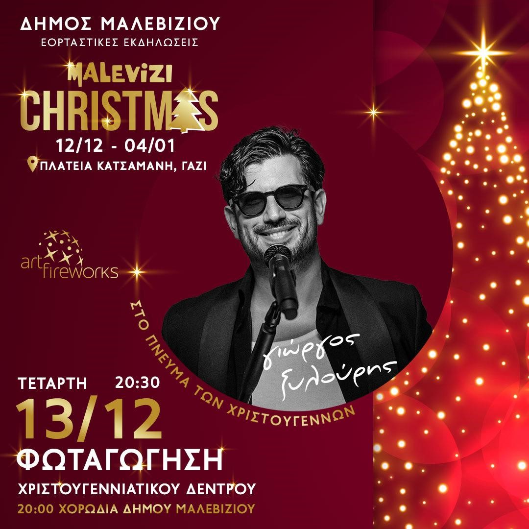 Την Τετάρτη 13 Δεκεμβρίου το πρόγραμμα για την φωταγώγηση θα ξεκινήσει στις 20.00 με τη Δημοτική Χορωδία Μαλεβιζίου ενώ στις 20.30 θα γίνει η φωταγώγηση. Τη σκυτάλη θα πάρει ο γνωστός ερμηνευτής Γιώργος Ξυλούρης έχοντας ετοιμάσει ένα πρόγραμμα με πολλές γνωστές επιτυχίες με στόχο να διασκεδάσει τον κόσμο που θα βρεθεί στην πλατεία.