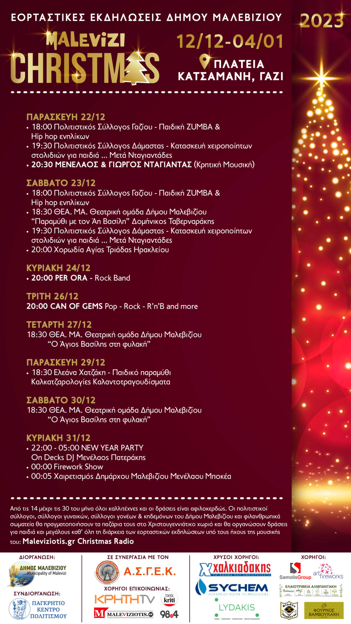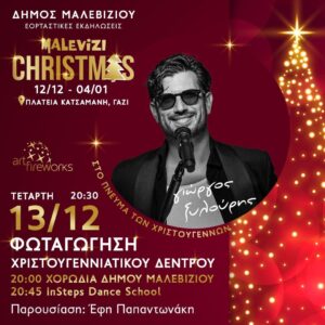 Οι Χριστουγεννιάτικες εκδηλώσεις ξεκινούν την Τετάρτη 13 Δεκεμβρίου με τη φωταγώγηση του Χριστουγεννιάτικου δέντρου στην πλατεία Μιχ, Κατσαμάνη. Το πρόγραμμα θα ξεκινήσει στις 17.30 με δράσεις για τα παιδιά από το Χαμόγελο του Παιδιού και στις 20.00 θα ακολουθήσει η Δημοτική Χορωδία Μαλεβιζίου μέχρι τις 20.30 που θα γίνει η φωταγώγηση του Χριστουγεννιάτικου δέντρου.