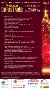 Επίσης πολιτιστικοί σύλλογοι από όλο το Δήμο θα παρουσιάσουν δράσεις τους αλλά και τοπικές γεύσεις κερνώντας μικρούς και μεγάλους ενώ η μουσική θα ξεκινάει από νωρίς το πρωί από Maleviziotis.gr Christmas Radio.