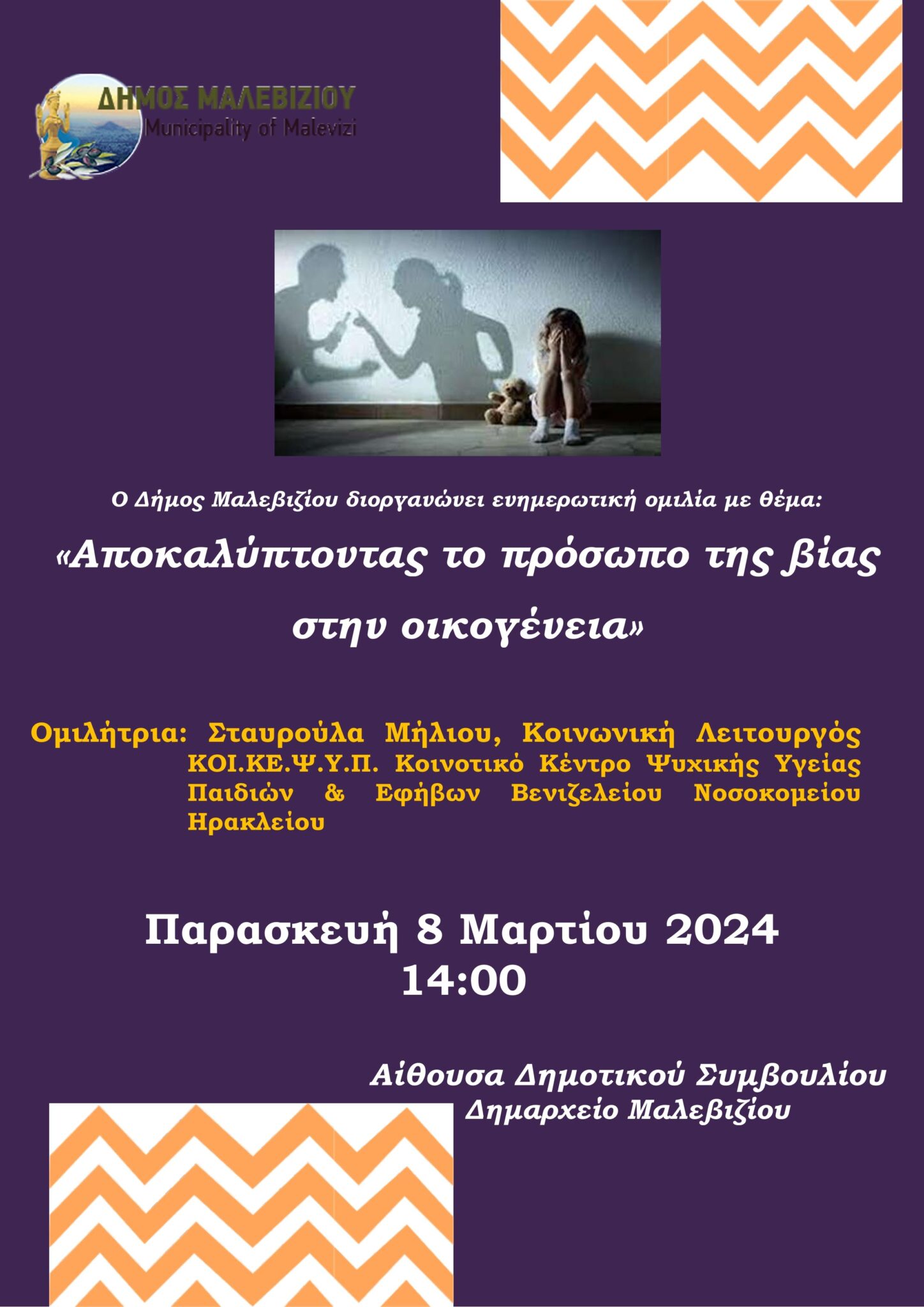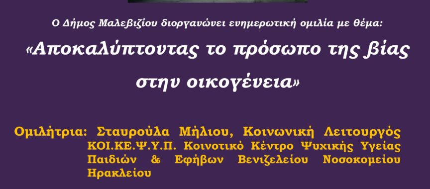 Ο Δήμος Μαλεβιζίου στα πλαίσια της Παγκόσμιας Ημέρας της Γυναίκας διοργανώνει την Παρασκευή 8 Μαρτίου 2024 και ώρα 14:00 ενημερωτική ομιλία με θέμα: