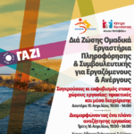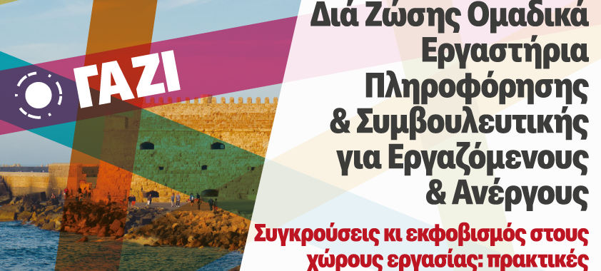 Την Δευτέρα 15 Απριλίου στις 11.00 στην Αίθουσα του Πολιτιστικού Κέντρου Αγίας Μαρίνας στο Τσαλικάκι με θέμα «Συγκρούσεις κι εκφοβισμός στους χώρους εργασίας: πρακτικές και μέσα διαχείρισης» (εργαστήριο εργαζομένων)