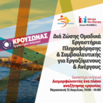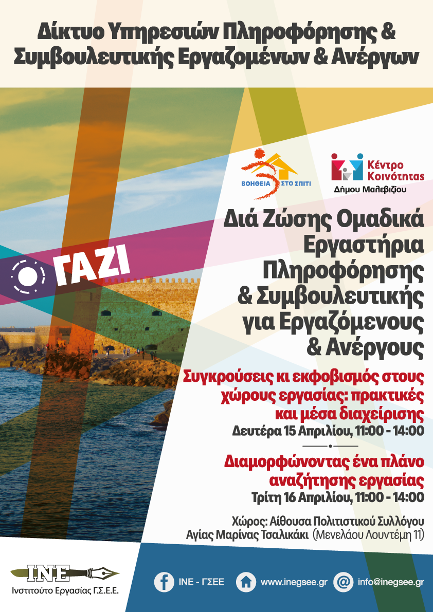 Σήμερα στον Κρουσώνα, ξεκινούν τα εργαστήρια συμβουλευτικής για εργαζόμενους και ανέργους που διοργανώνουν το Κέντρο Κοινότητας του Δήμου Μαλεβιζίου σε συνεργασία με το Δίκτυο Πληροφόρησης και Συμβουλευτικής Εργαζομένων και Ανέργων του ΙΝΕ ΓΣΕΕ Κρήτης.