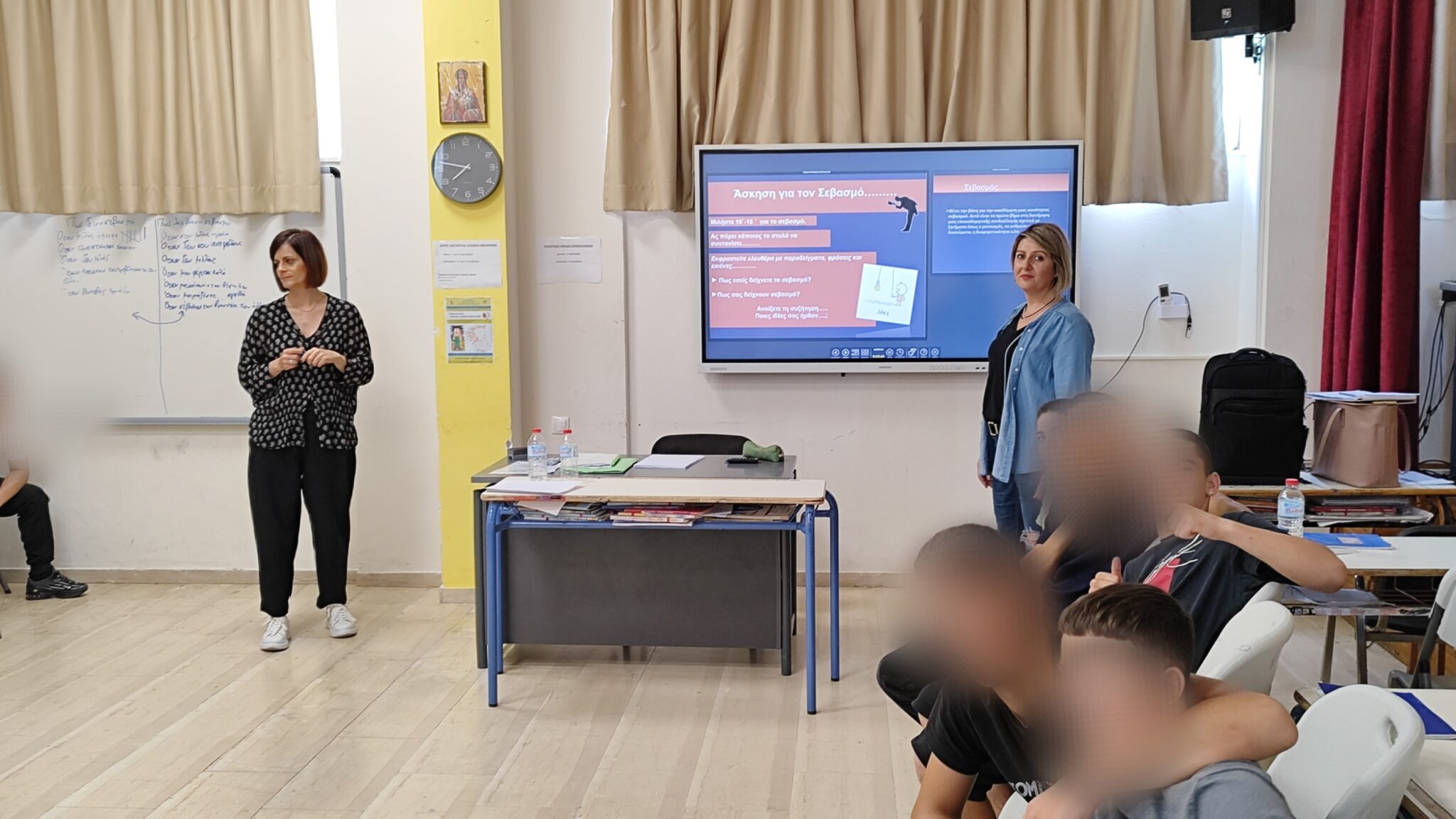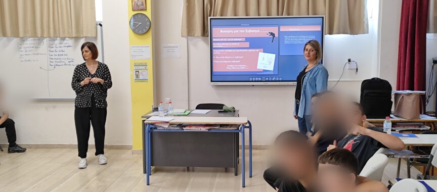 Μετά το καλωσόρισμα από την κ. Βικτωρία Χαλκιά, εκπαιδευτικό και συντονίστρια δράσης του σχολείου, οι κυρίες Αμαλία Αγγουρίδη συντονίστρια κοινωνική λειτουργός και Λίνα Πελεκίδου κοινωνική λειτουργός, ενημέρωσαν τους μαθητές για την κοινωνική προστασία που υποστηρίζει το Κέντρο Κοινότητας μέσα από τη συμβουλευτική υποστήριξη και γενικότερα για τις υπηρεσίες της δομής και προχώρησαν στην βιωματική δράση «Επικοινωνία και Σχέσεις μεταξύ μαθητών με κυριότερο στοιχείο αυτό του Σεβασμού».