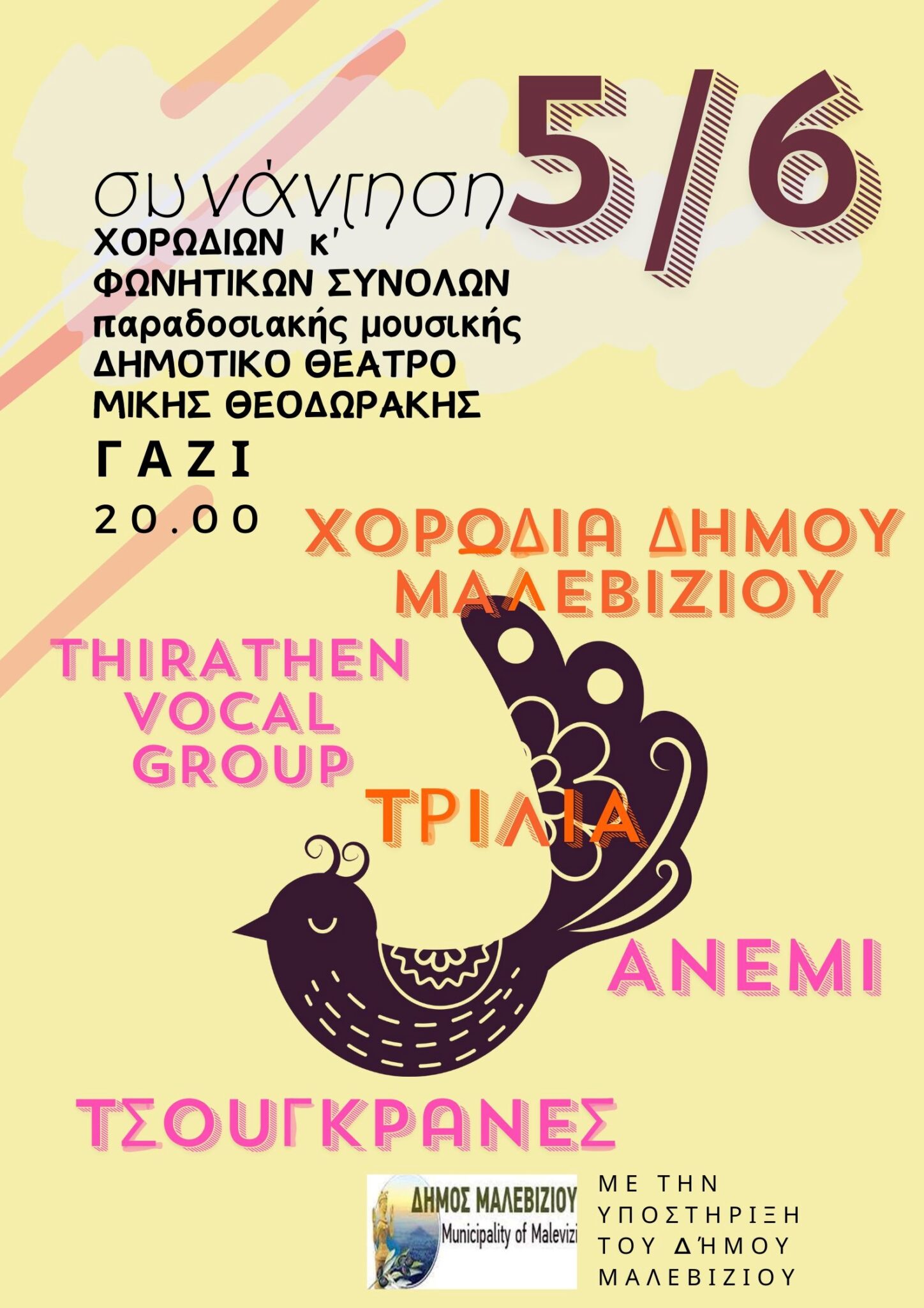 Για πρώτη φορά Χορωδίες και Φωνητικά Σύνολα που δραστηριοποιούνται στο Μαλεβίζι και στο Ηράκλειο συναντιούνται σε μία εκδήλωση που θα πραγματοποιηθεί απόψε στο Δημοτικό Θέατρο Μαλεβιζίου Μίκης Θεοδωράκης στο Γάζι