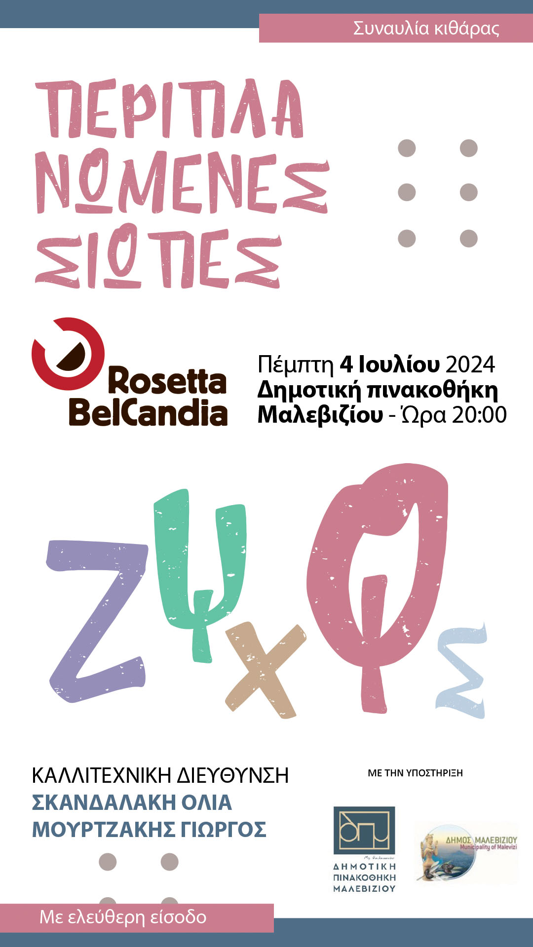 Οι «Ιδανικές Φωνές» συναντούν τις «Περιπλανώμενες Σιωπές», σε μία συνύπαρξη της γλυπτικής με τη μουσική, την Πέμπτη 4 Ιουλίου στη Δημοτική Πινακοθήκη Μαλεβιζίου. Πρόκειται για μία συναυλία από το μουσικό σύνολο Rosetta BelCandia που θα πραγματοποιηθεί στον προαύλιο χώρο της της Δημοτικής Πινακοθήκης Μαλεβιζίου στις 20.00, ενώ θα πραγματοποιηθεί και ξενάγηση στην έκθεση του γλύπτη Κωνσταντίνου Παγωμένου που φιλοξενείται στην Πινακοθήκη.
