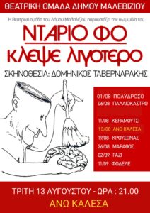 Μετά τη Μονή, το Πολύδροσο, το Παλαιόκαστρο και το Κεραμούτσι η Θεατρική Ομάδα του Δήμου Μαλεβιζίου θα παρουσιάσει την κωμωδία του Ντάριο Φο «Κλέψε Λιγότερο» στα Άνω Καλέσα την Τρίτη 13 Αυγούστου στις 21.00.