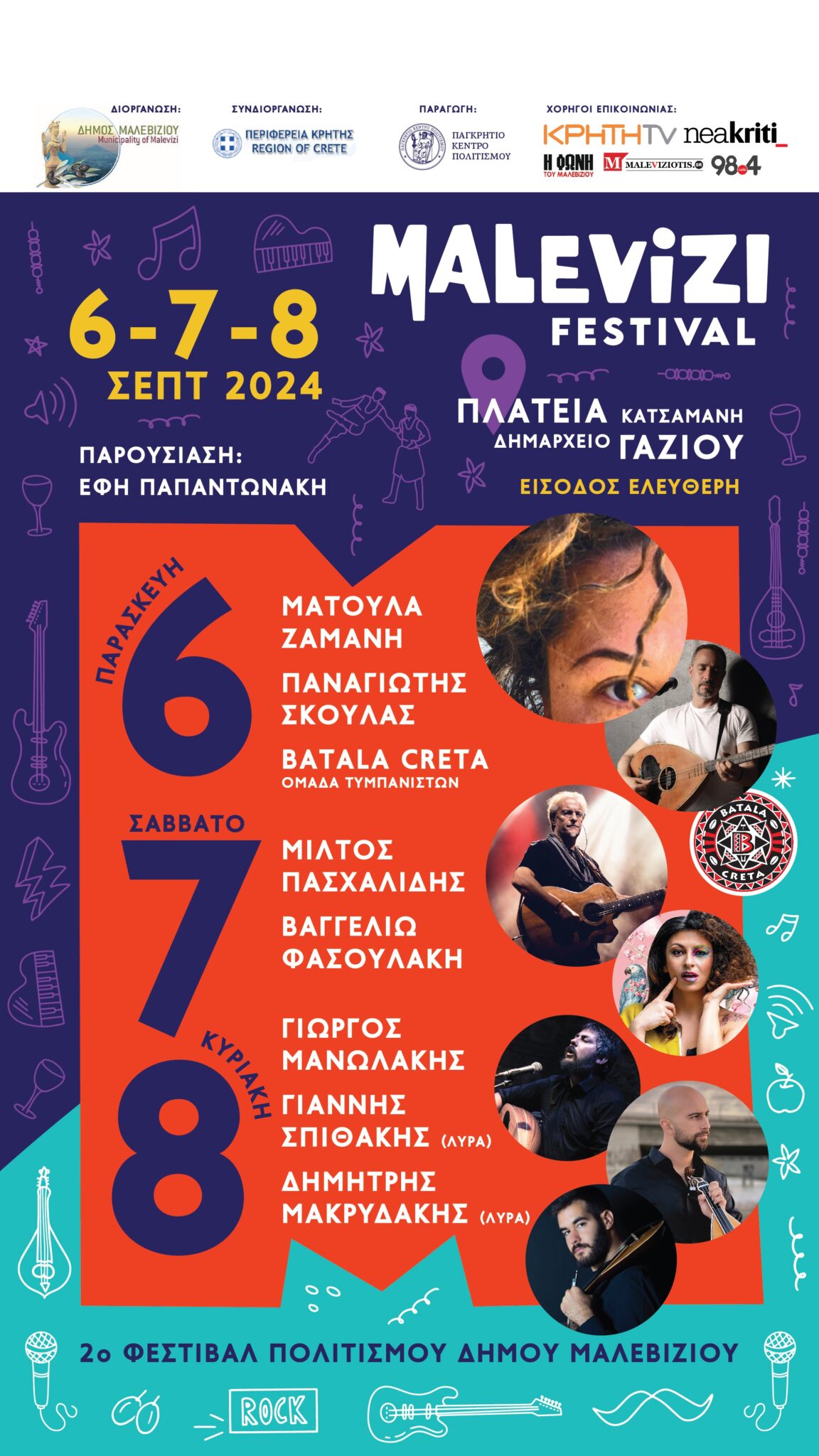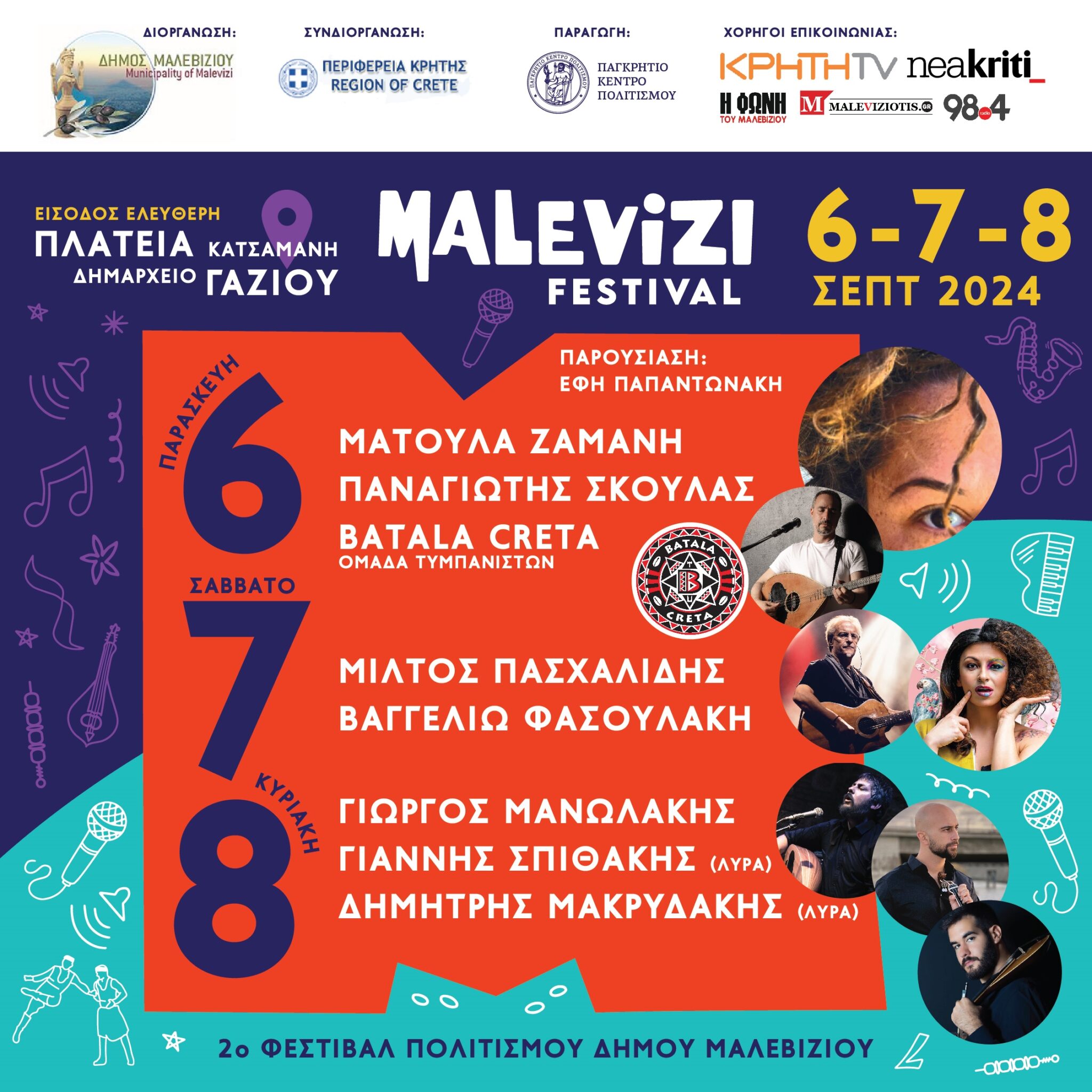 Το MALEVIZI FESTIVAL ήρθε για να μείνει και αυτό φάνηκε από τις χιλιάδες κόσμου που αγκάλιασαν την πρώτη προσπάθεια που έγινε τον Σεπτέμβριο του 2023. Φέτος ο πήχης μπαίνει ψηλά και ο στόχος του Δήμου Μαλεβιζίου είναι, το 2ο MALEVIZI FESTIVAL να αποτελέσει σημείο αναφοράς στα πολιτιστικά δρώμενα του νησιού.