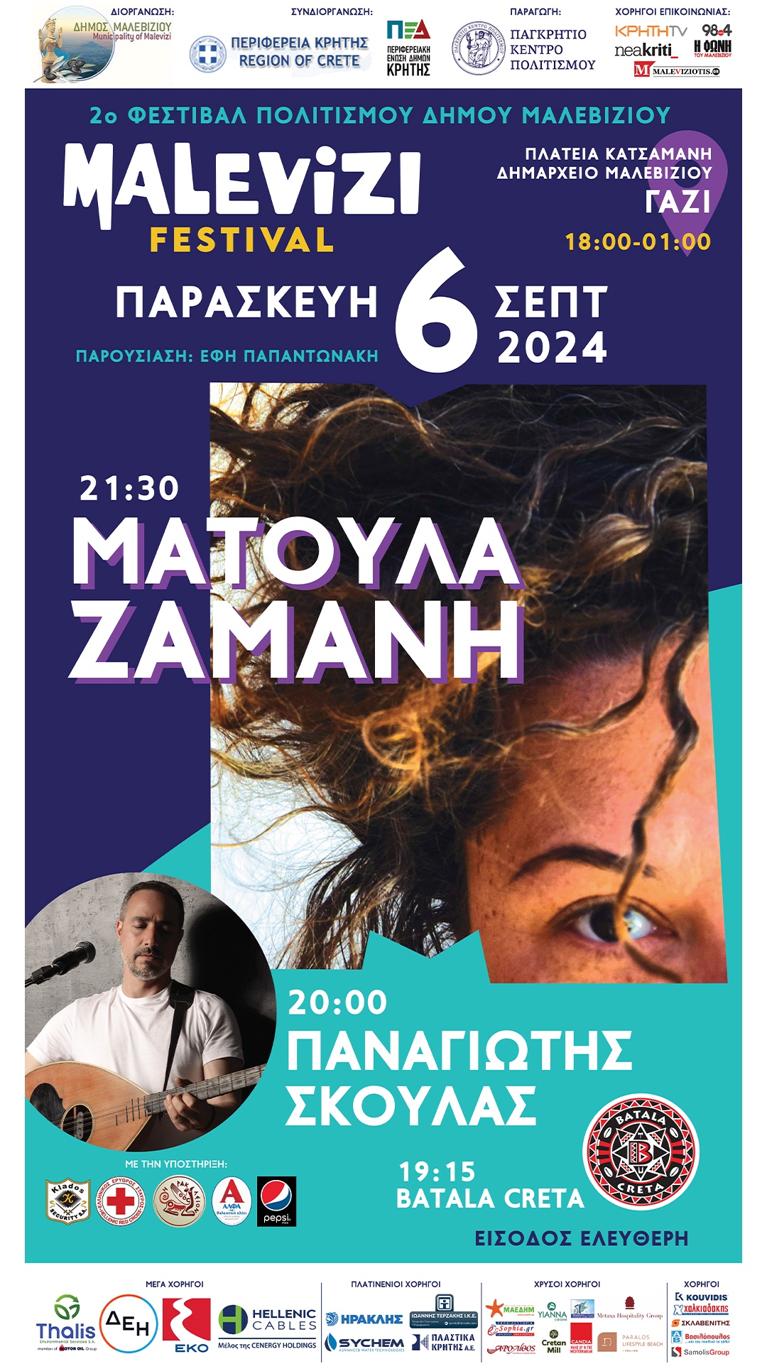 Η πρώτη μέρα του 2ου Malevizi Festival θα κλείσει με τη Ματούλα Ζαμάνη, από τις πιο αγαπημένες φωνές του έντεχνου τραγουδιού, η οποία θα παρουσιάσει ένα μοναδικό πρόγραμμα που συνδυάζει παραδοσιακούς ήχους με σύγχρονα ακούσματα. Με την ιδιαίτερη φωνή της και την μοναδική σκηνική παρουσία της, η Ματούλα Ζαμάνη υπόσχεται να χαρίσει στο κοινό μια αξέχαστη μουσική εμπειρία.