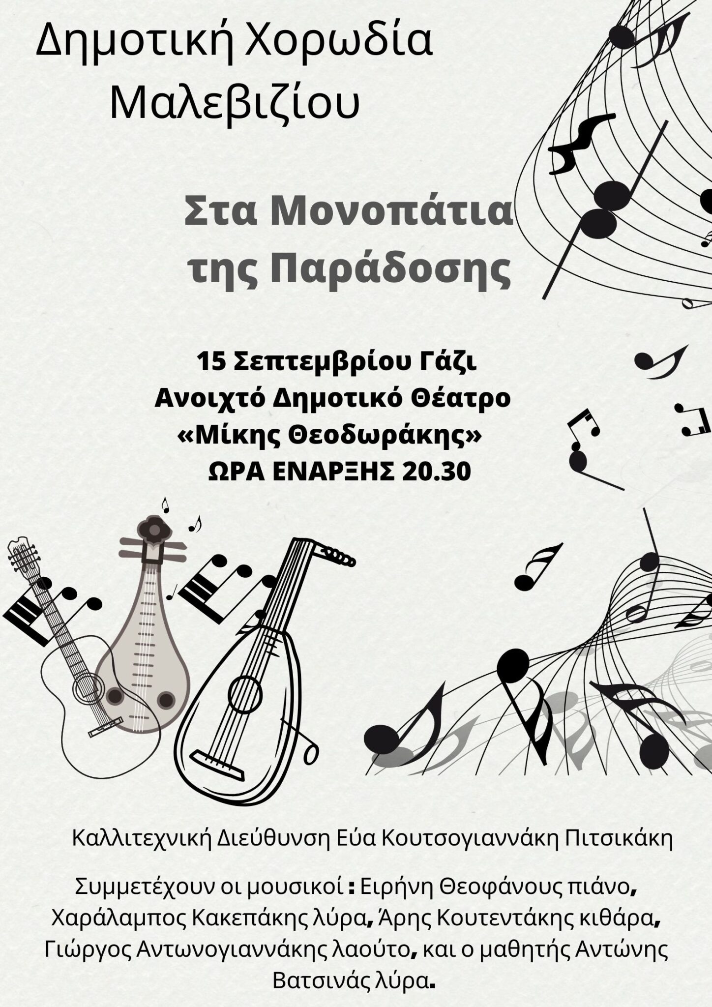 Στο Γάζι, στο Ανοιχτό Δημοτικό Θέατρο Μίκης Θεοδωράκης η Χορωδία του Δήμου Μαλεβιζίου θα παρουσιάσει τη μουσική παράσταση «Μονοπάτια της Παράδοσης» την Κυριακή 15 Σεπτεμβρίου στις 20.30.