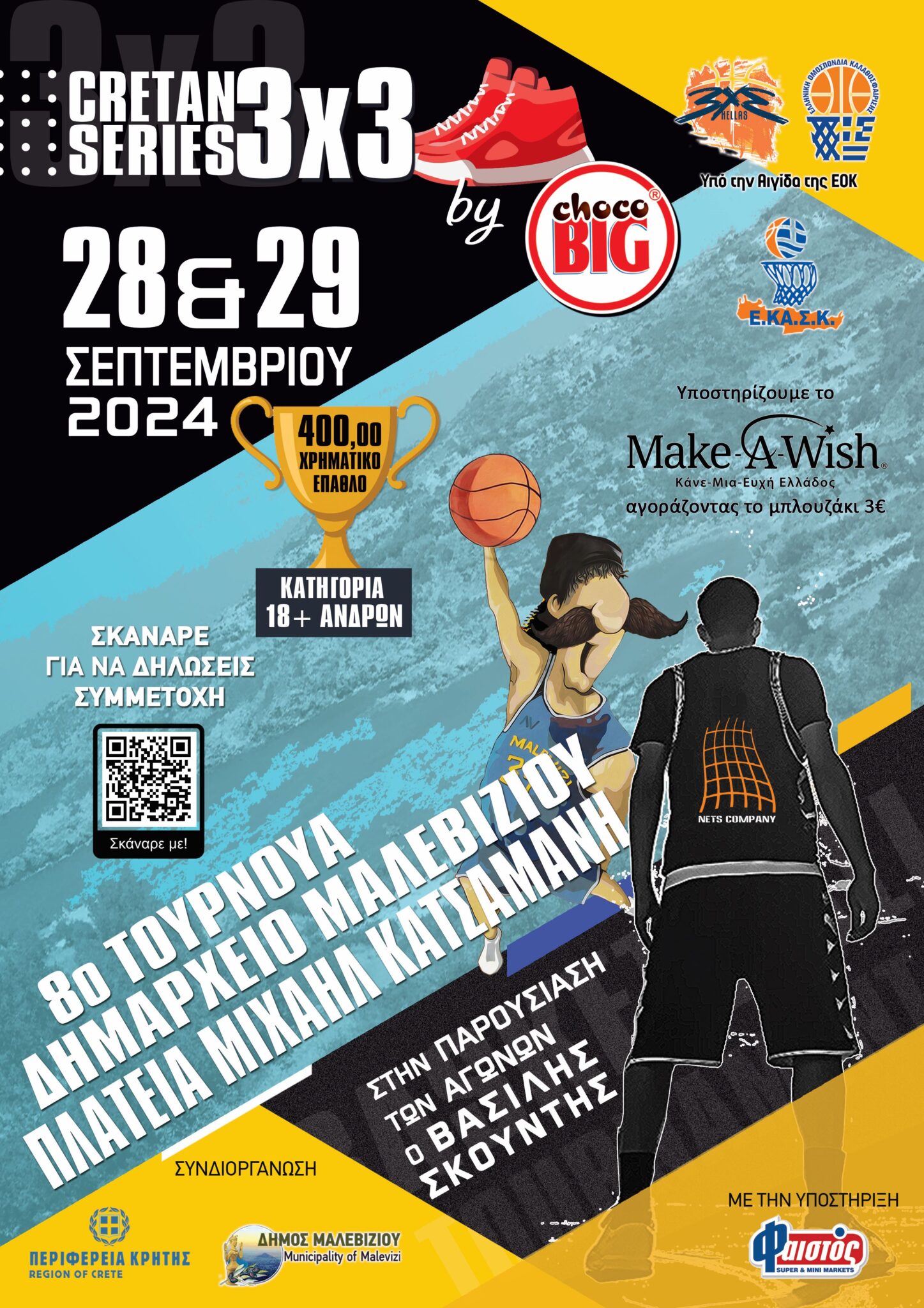 Το δεύτερο Τουρνουά 3×3 Basketball «Cretan Series» συνδιοργανώνεται από την Περιφέρειας Κρήτης, τον Δήμο Μαλεβιζίου και τη Nets Company και τελεί υπό την αιγίδα της Ελληνικής Ομοσπονδίας Καλαθοσφαίρισης και της Ένωσης Καλαθοσφαιρικών Σωματείων Κρήτης.