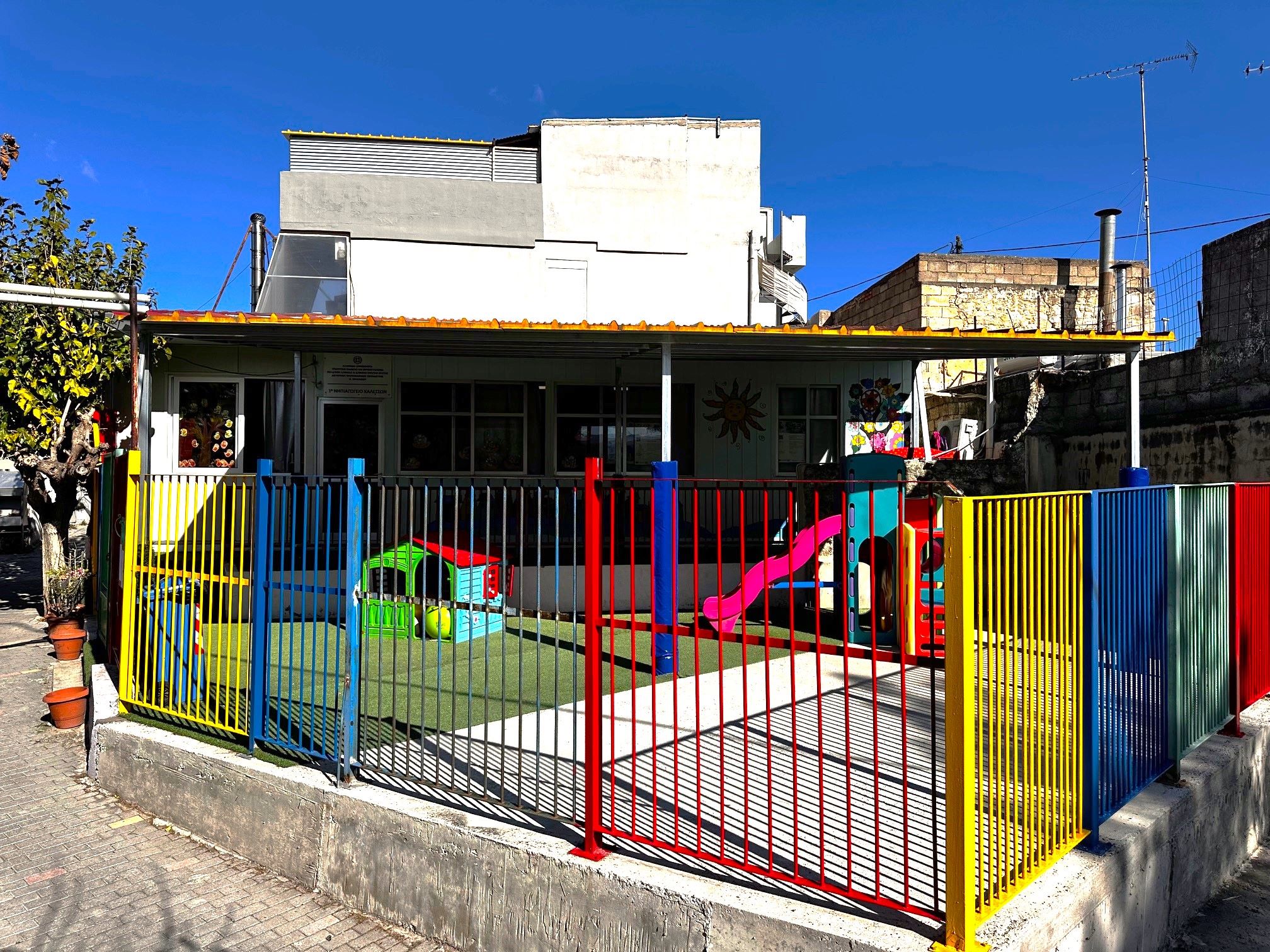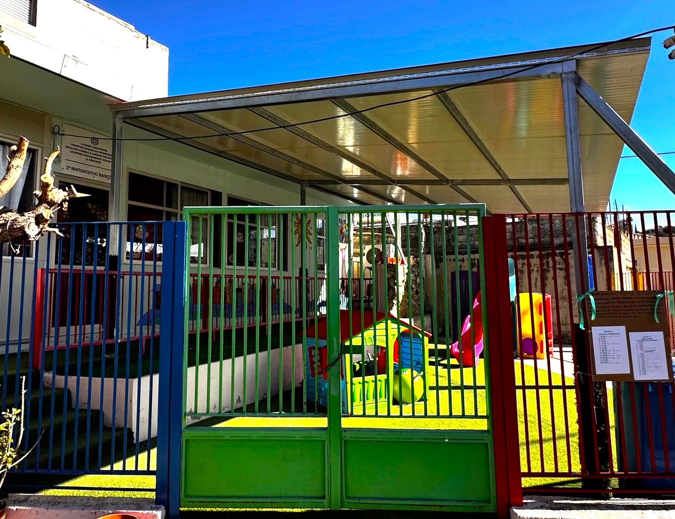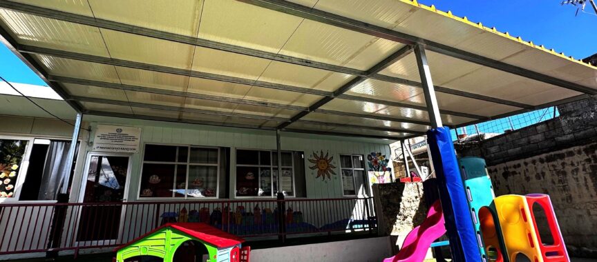Στην τοποθέτηση στέγαστρου στην αυλή του Νηπιαγωγείου Καλεσών προχώρησε ο Δήμος Μαλεβιζίου, με σκοπό την προστασία των παιδιών από τις δυσμενείς καιρικές συνθήκες, όπως η βροχή και ο ήλιος.