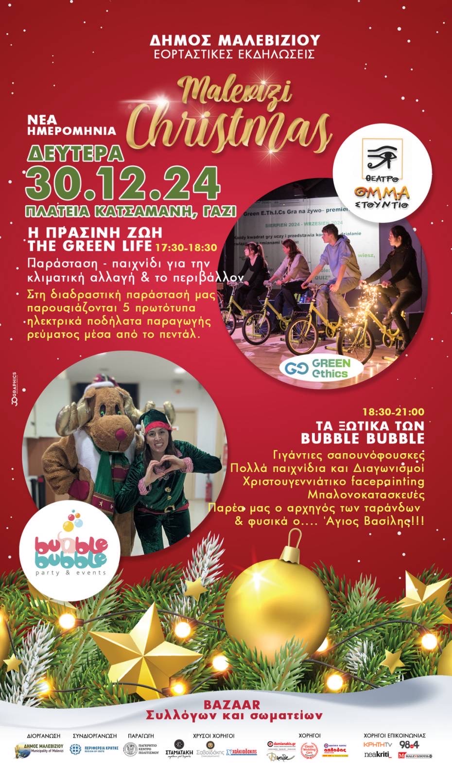 Τα χαρούμενα ξωτικά θα γεμίσουν την πλατεία με ζωντάνια, προσφέροντας παιχνίδια, διαγωνισμούς, face painting και μπαλονοκατασκευές που θα χαρίσουν χαμόγελα και αξέχαστες στιγμές.