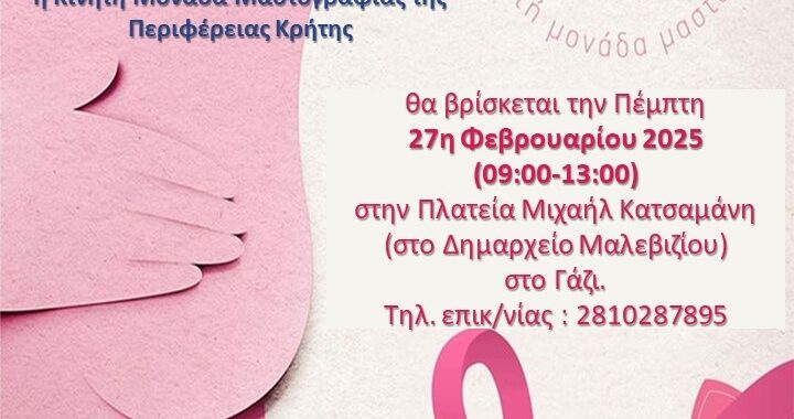 «Η πρόληψη είναι στάση ζωής», με αυτό το σύνθημα και συνεχίζοντας το ταξίδι της σε όλη την Κρήτη η Κινητή Μονάδα Μαστογραφίας της Περιφέρειας Κρήτης θα βρίσκεται στην πλατεία Μιχ. Κατσαμάνη στο Γάζι την Πέμπτη 27 Φεβρουαρίου από τις 09.00 το πρωί.