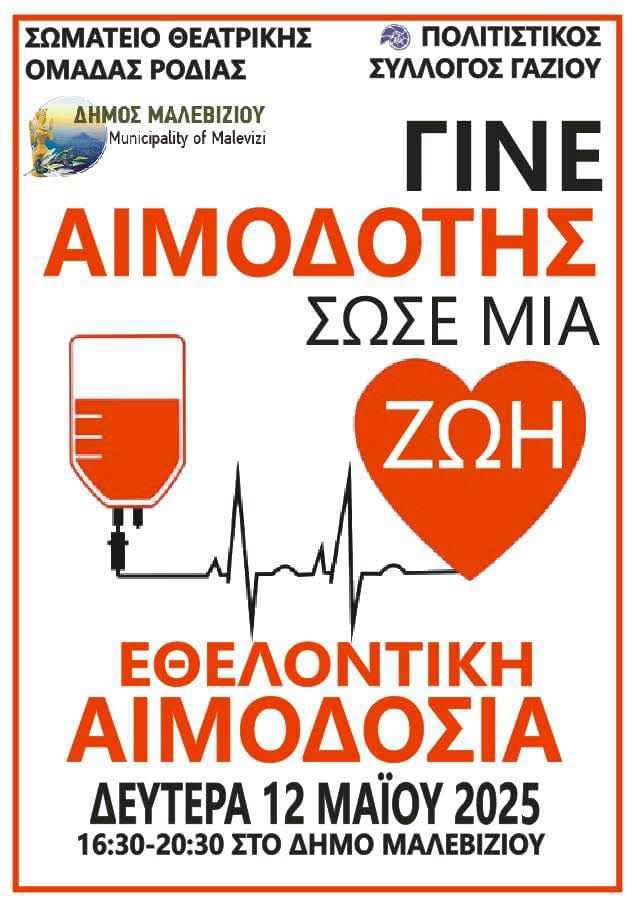 Το Σωματείο Θεατρικής Ομάδας Ροδιάς, ο Πολιτιστικός Σύλλογος Γαζίου και ο Δήμος Μαλεβιζίου καλούν τους πολίτες να κάνουν ένα δώρο ζωής, συμμετέχοντας στην εθελοντική αιμοδοσία που διοργανώνουν.