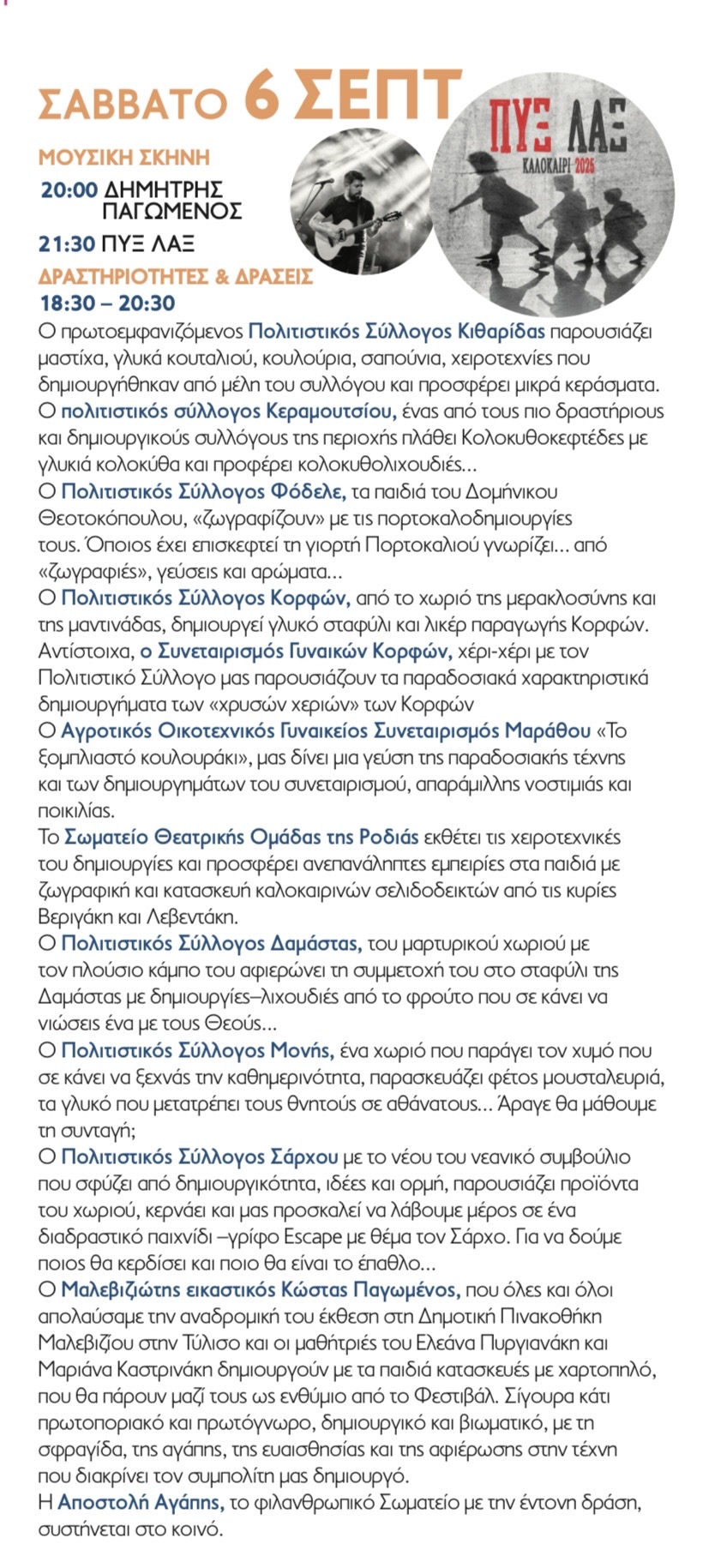 - Ο πρωτοεμφανιζόμενος Πολιτιστικός Σύλλογος Κιθαρίδας παρουσιάζει μαστίχα , γλυκά κουταλιού, κουλούρια, σαπούνια, χειροτεχνίες που δημιουργήθηκαν από μέλη του συλλόγου και προσφέρει μικρά κεράσματα.