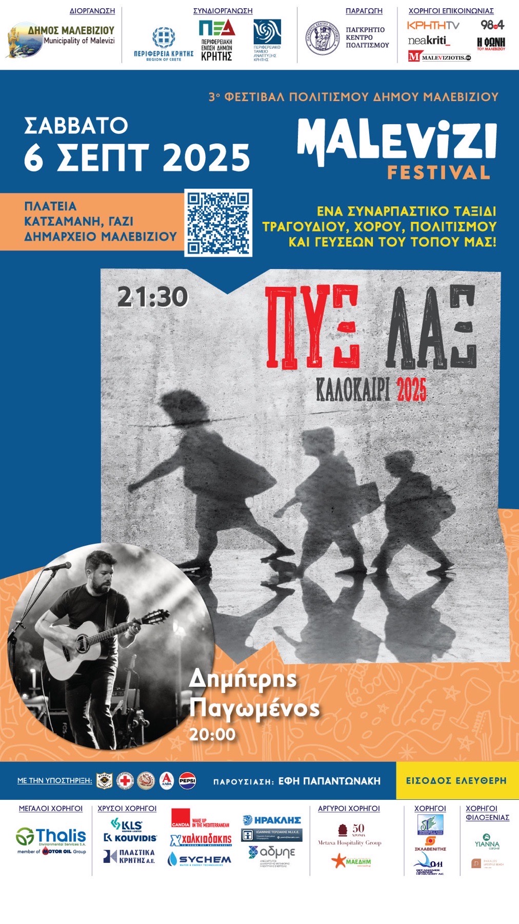 Η μεγάλη γιορτή συνεχίζεται και απόψε, Σάββατο, με πλούσιο πρόγραμμα. Στις 20:00 ανεβαίνει στη σκηνή του 3ου Malevizi Festival ο Δημήτρης Παγωμένος, ενώ στις 21:30 θα ακολουθήσουν οι θρυλικοί ΠΥΞ ΛΑΞ, ένα συγκρότημα που όλοι έχουμε αγαπήσει και που τα τραγούδια του έχουν συνοδεύσει στιγμές και αναμνήσεις όλων μας.