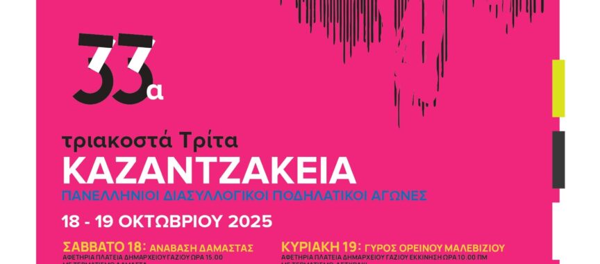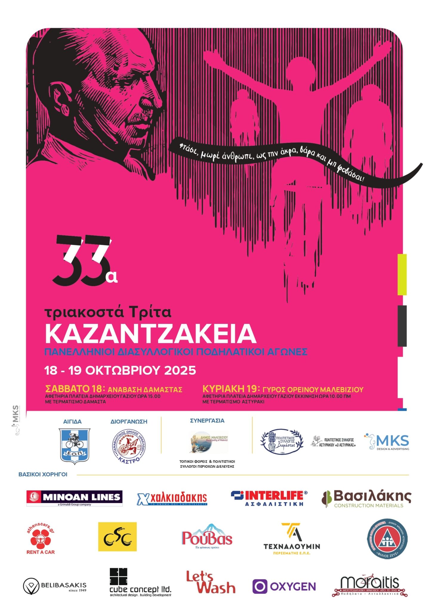 Με τη συνδιοργάνωση του Δήμου Μαλεβιζίου της Περιφέρειας Κρήτης και του Δήμου Ηρακλείου, θα πραγματοποιηθούν το Σάββατο 18 και την Κυριακή 19 Οκτωβρίου 2025 οι Πανελλήνιοι Αγώνες Ποδηλασίας “33α Καζαντζάκεια”, με διοργανωτή τον Παναθλητικό Όμιλο Ηρακλείου (Π.Ο.Η.) “Κάστρο”.