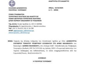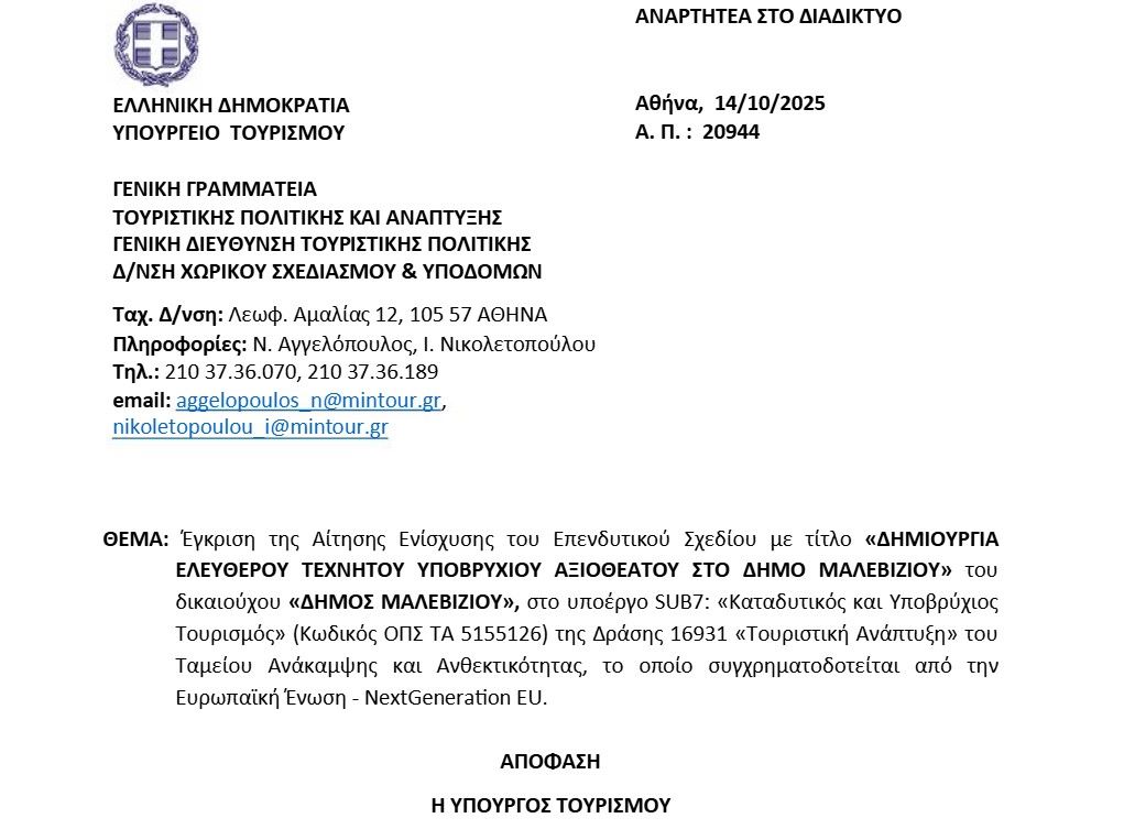 Ένα σημαντικό βήμα για την ανάπτυξη του Καταδυτικού Τουρισμού και την ανάδειξη του θαλάσσιου πλούτου της περιοχής έκανε ο Δήμος Μαλεβιζίου, εξασφαλίζοντας χρηματοδότηση ύψους 221.612 ευρώ από το Ταμείο Ανάκαμψης, μέσω του Υπουργείου Τουρισμού, για τη δημιουργία Καταδυτικού Πάρκου στην Αγία Πελαγία.
