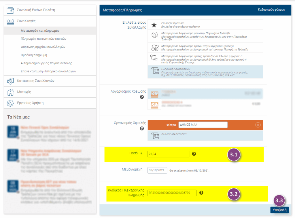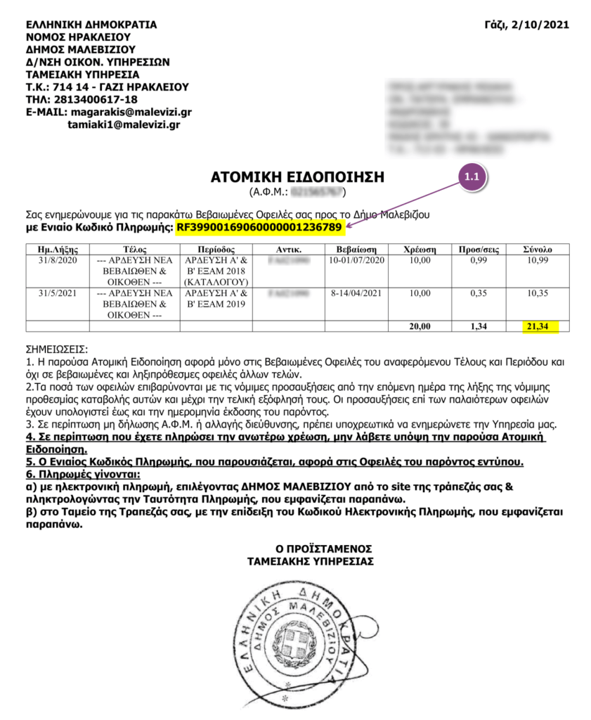- Γίνεται με χρήση της Ταυτότητας Οφειλής (25ψήφιος Κωδικός ΔΙΑΣ – RF) ο οποίος αναγράφεται στο έντυπο ειδοποιητήριο.