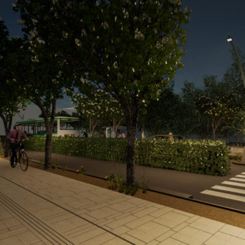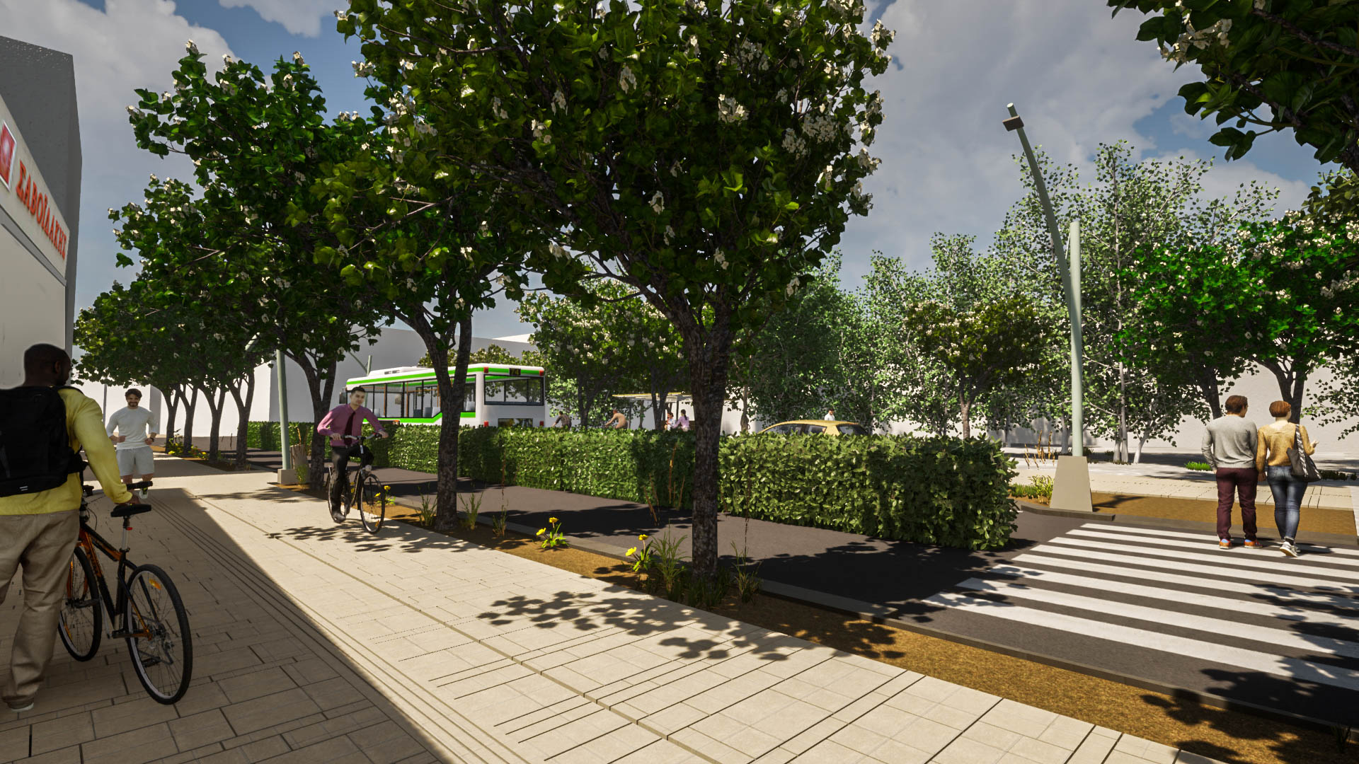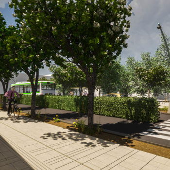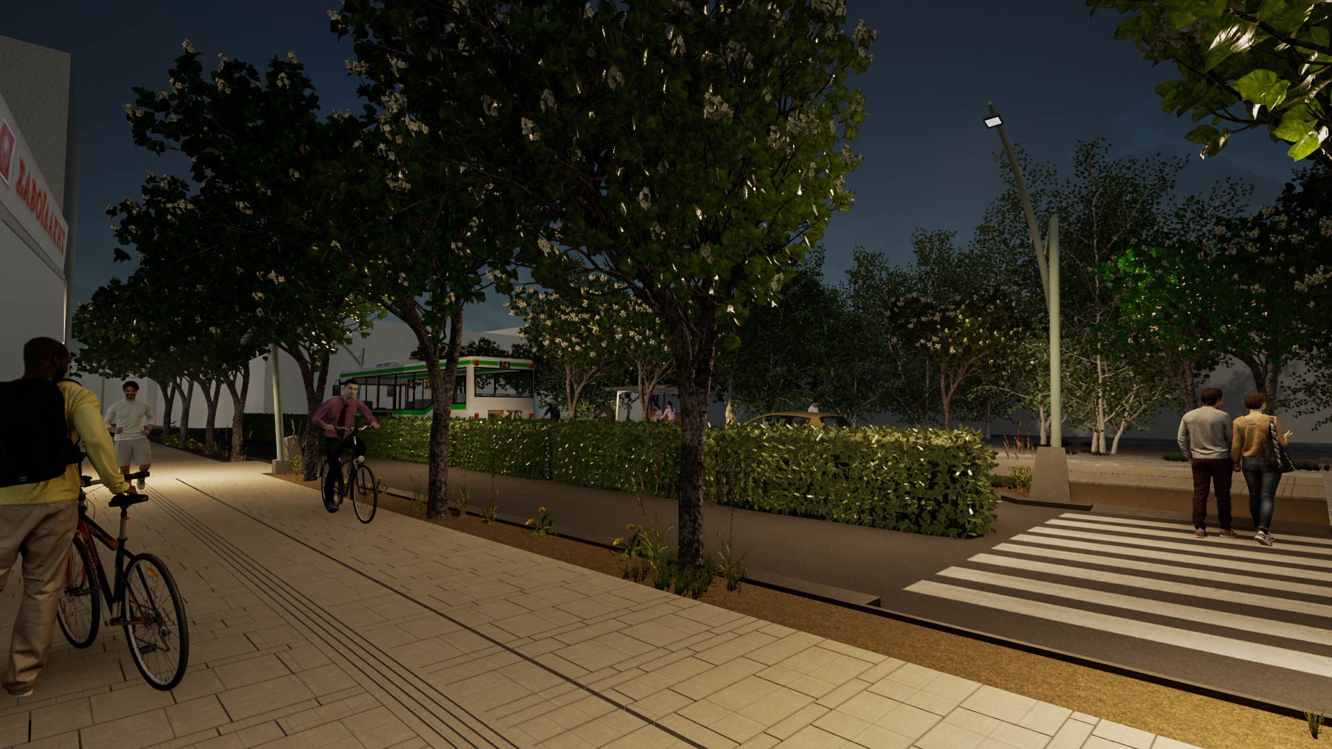 - Γραμμικές, υψηλές και χαμηλές φυτεύσεις στο μεγαλύτερο μήκος της εξωτερικής λωρίδας του πεζοδρομίου για οπτικό και λειτουργικό διαχωρισμό της κίνησης και της στάθμευσης δίπλα στον δρόμο.