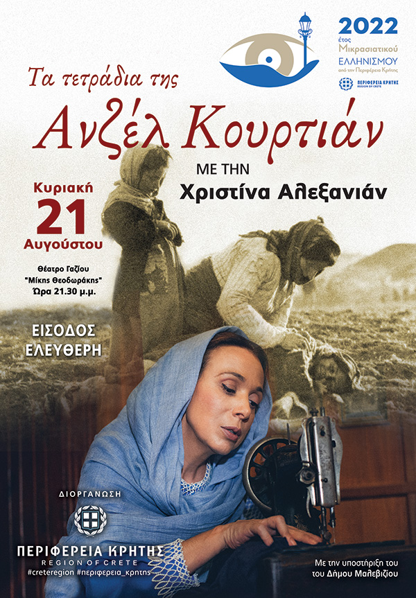 Η παράσταση «Τα τετράδια της Ανζέλ Κουρτιάν» διοργανώνεται από την Περιφέρεια Κρήτης με την υποστήριξη του Δήμου Μαλεβιζίου με ελεύθερη είσοδο για το κοινό.